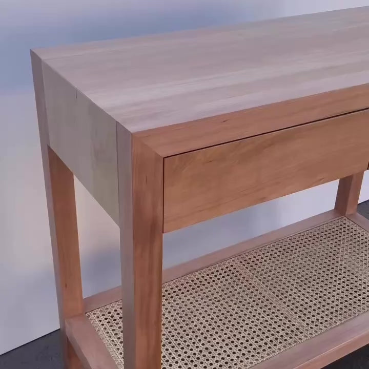 Fabricación en madera de lenga,  incluye dos cajones y base tejido ratán.