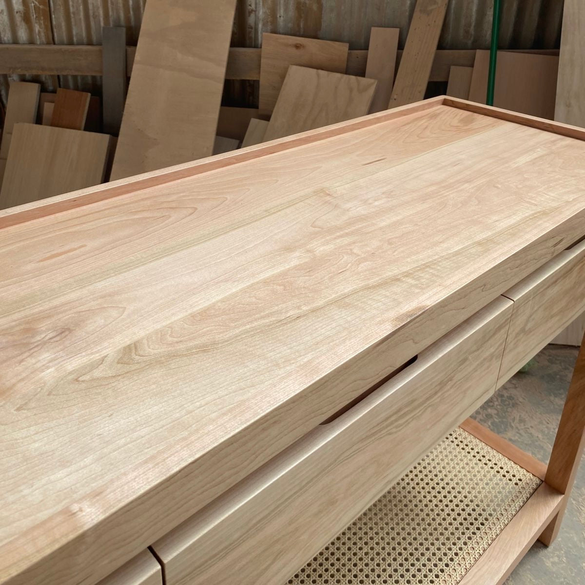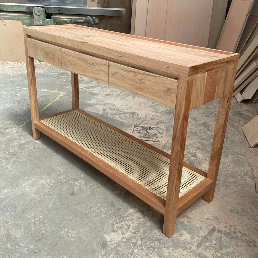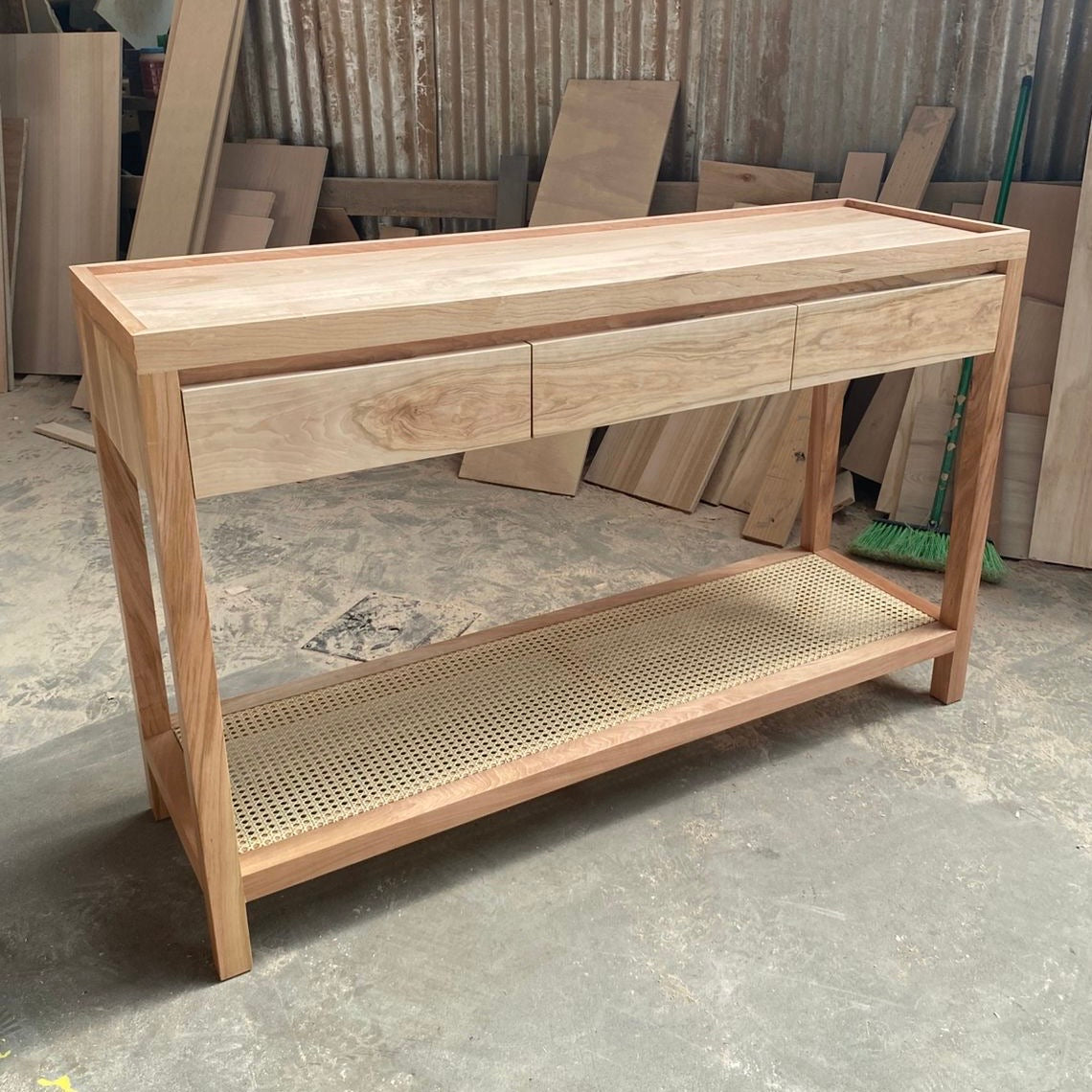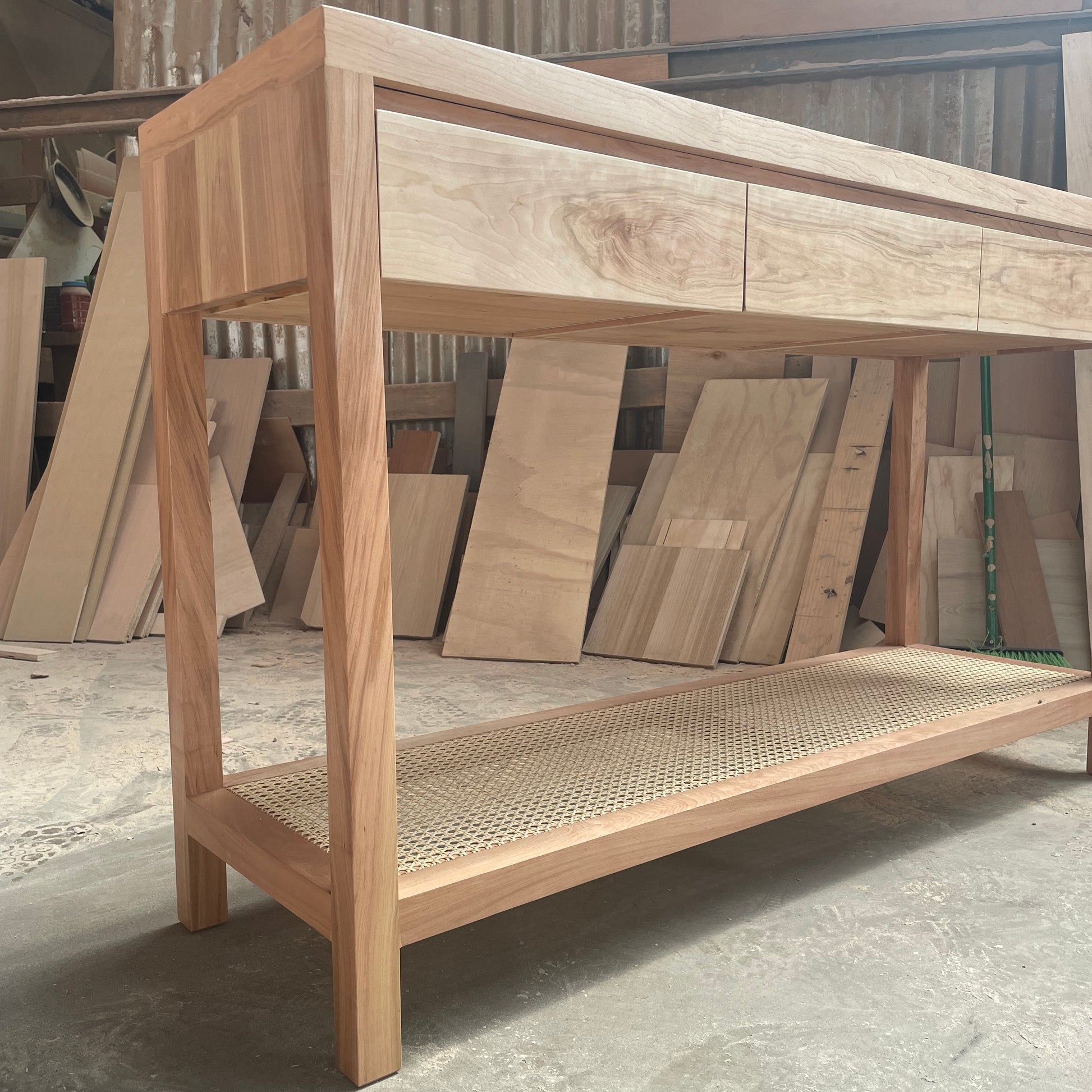 Superficie con borde, 3 cajones con tirador corrido. Masera de lenga y ratán.