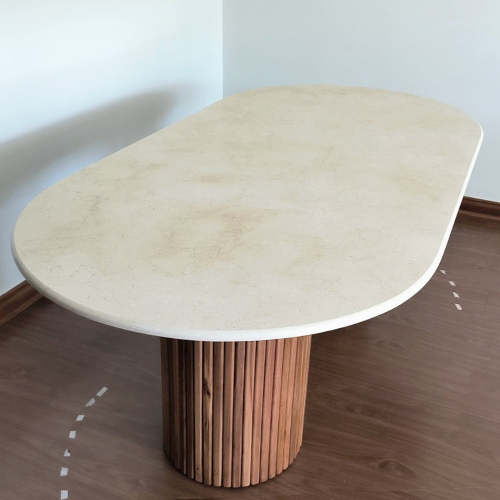 Comedor mármol con bases en madera de Raulí