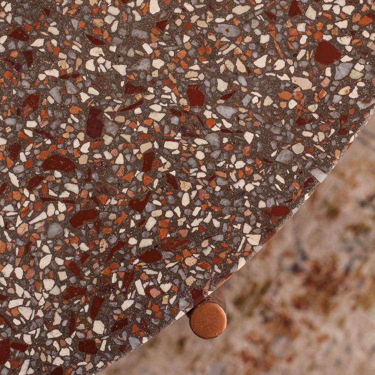 Cada mesa de terrazo es una pieza artesanal, creada a mano en Chile por artesanos que dominan el oficio con precisión y dedicación. Cada superficie se elabora cuidadosamente, combinando fragmentos minerales y pigmentos para lograr una textura y tonalidad únicas, imposibles de repetir.