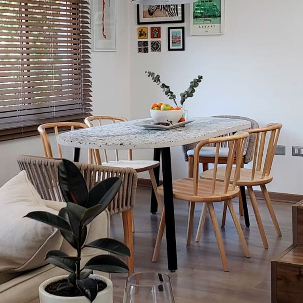 Cada mesa de terrazo es una pieza artesanal, creada a mano en Chile por artesanos que dominan el oficio con precisión y dedicación. Cada superficie se elabora cuidadosamente, combinando fragmentos minerales y pigmentos para lograr una textura y tonalidad únicas, imposibles de repetir.
