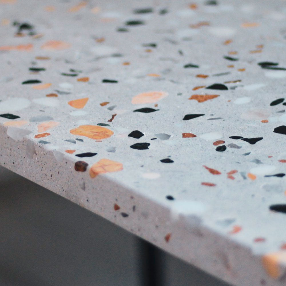 terrazzo, un material que nace en la Venecia del siglo XV y que se compone principalmente de cemento y materiales naturales como piedras, mármoles, cuarzos y pigmentos.
