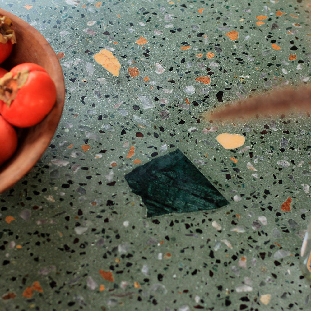 terrazzo, un material que nace en la Venecia del siglo XV y que se compone principalmente de cemento y materiales naturales como piedras, mármoles, cuarzos y pigmentos.