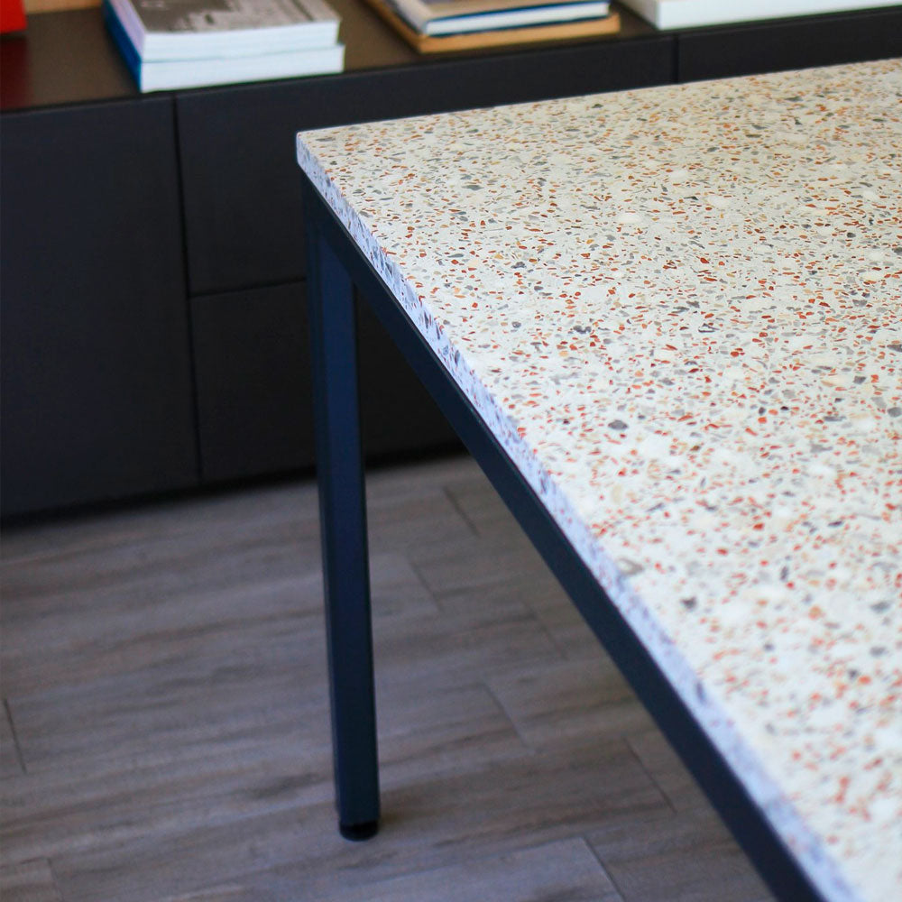 Cada mesa de terrazo es una pieza artesanal, creada a mano en Chile por artesanos que dominan el oficio con precisión y dedicación. Cada superficie se elabora cuidadosamente, combinando fragmentos minerales y pigmentos para lograr una textura y tonalidad únicas, imposibles de repetir.