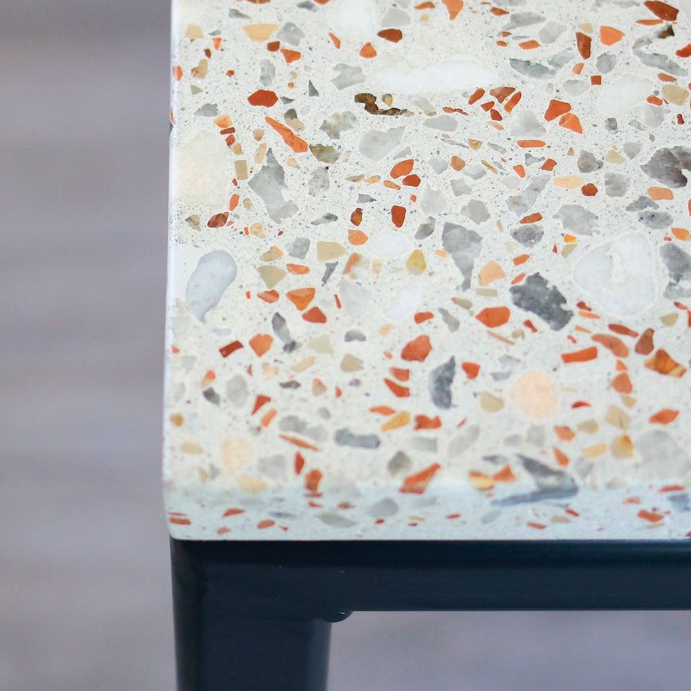 terrazzo, un material que nace en la Venecia del siglo XV y que se compone principalmente de cemento y materiales naturales como piedras, mármoles, cuarzos y pigmentos.