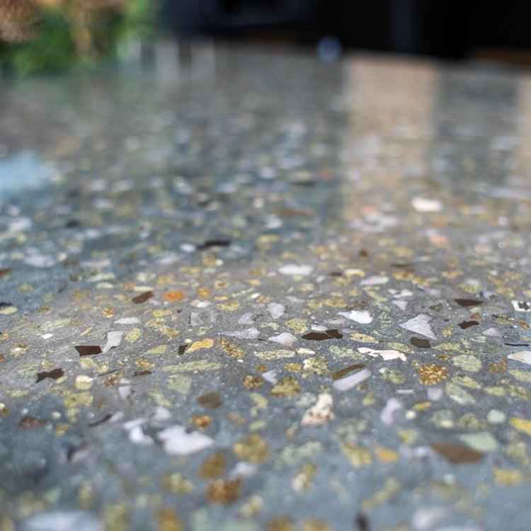 terrazzo, un material que nace en la Venecia del siglo XV y que se compone principalmente de cemento y materiales naturales como piedras, mármoles, cuarzos y pigmentos.