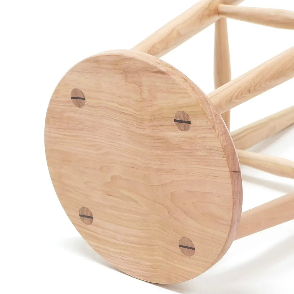 El Taburete W es nuestra interpretación del clásico diseño Windsor, fabricado en madera sólida, las piezas han sido cuidadosamente torneadas y ensamblas mediante la técnica de espiga pasante con cuña, logrando una unión fuerte y duradera y que le da un detalle único en su asiento